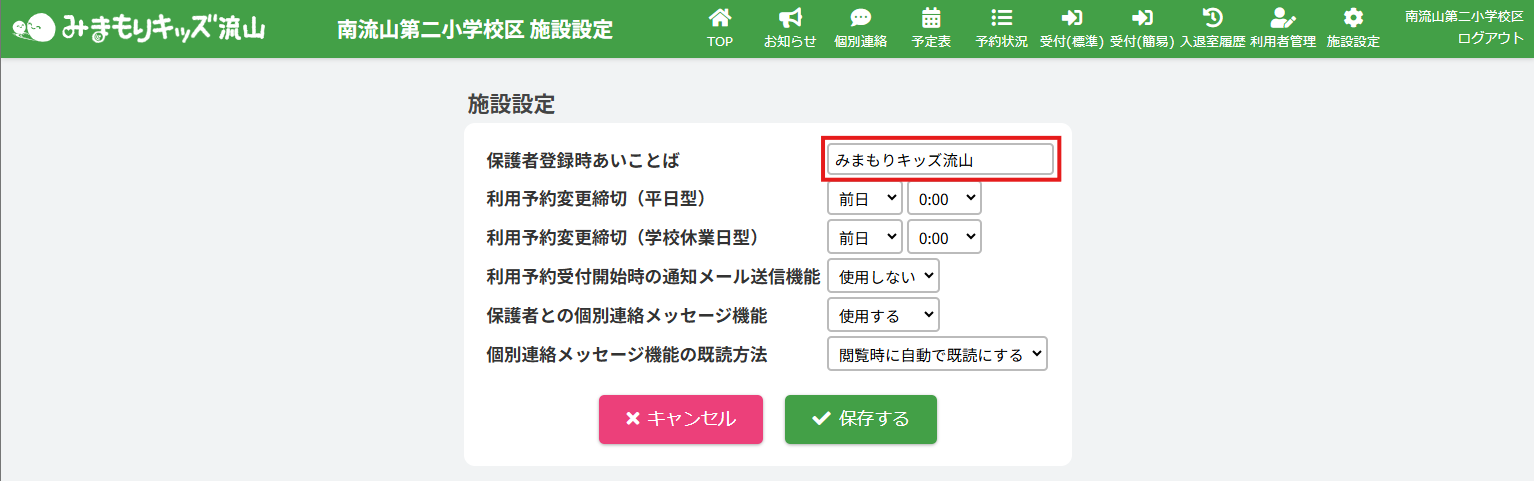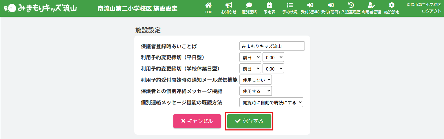 施設開所日(土曜型)において、保護者が利用予約を変更できる時間の締切を設定できます。締切後は電話等でお問い合わせを頂き、施設側で変更します。