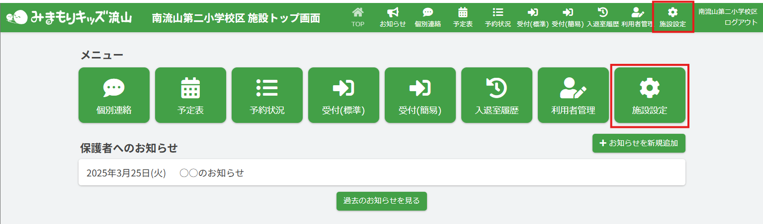 トップ画面または画面右上の、【施設設定】をクリックしてください。