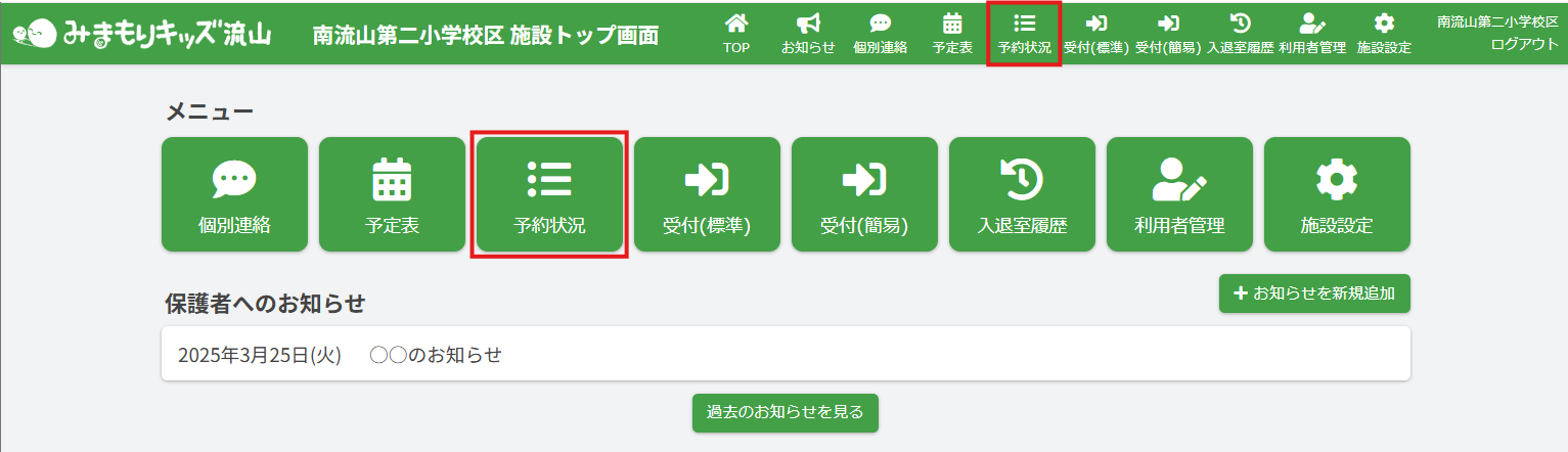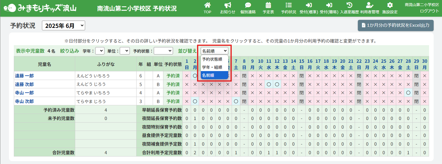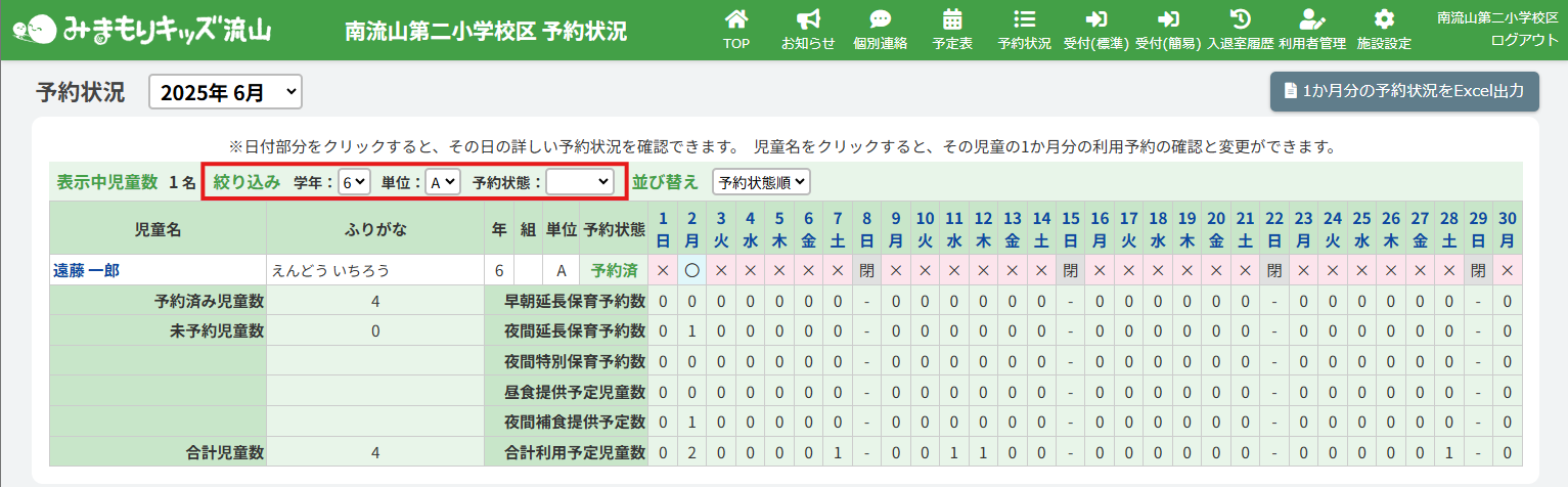 HOME > 予約状況 > 予約状況を確認する 予約状況を確認する 「予約状況」とは…児童の利用予約を確認できる機能です。 当月の予約状況、日付別の予約状況、児童別の予約状況を確認することができます。 ここでは、当月の予約状況の確認方法や、一覧表示の並び替え・特定児童のみを表示させる機能の確認ができます 1.予約状況を開く トップ画面または画面右上にある、【予約状況】をクリックしてください。 2.確認したい月を選択する 左上の【20XX年X月】のプルダウンより確認したい月を選択し、予約状況を表示してください。 各表記については下記の表をご確認ください。 〇 その日に利用予定のある児童を指します。 × その日は利用予定がない児童を指します。 閉 施設が閉所していることを指します。 <絞り込み機能> 一覧の中から特定の児童を探すための絞り込み機能です。 絞り込み機能は2項目以上を組み合わせることも可能です。(例:1学年+単位B…1学年かつ単位がBの児童のみが表示されます。) <並び替え機能> 一覧の中から特定の児童を探しやすく整理する機能です。 指定した並び替えの順番はページを移動しても維持されます。並び替えの詳細については下記の表をご確認ください。 予約状態順 予約状態が予約済の児童と未予約の児童を並び替えて表示します。 学年・組順 学年・組が若い順に並び替えて表示します。 名前順 名前順に並び替えて表示します。 児童別予約状況を確認、更新する ≫