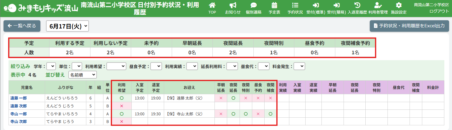 選択した日付の予約状況を、総数や児童別に確認することができます。