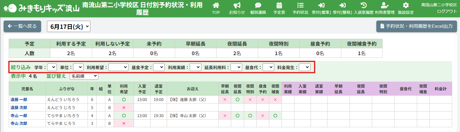 ここでは、日付別の予約状況を確認する方法や、一覧表示の並び替え・特定児童のみを表示させる機能の確認ができます。