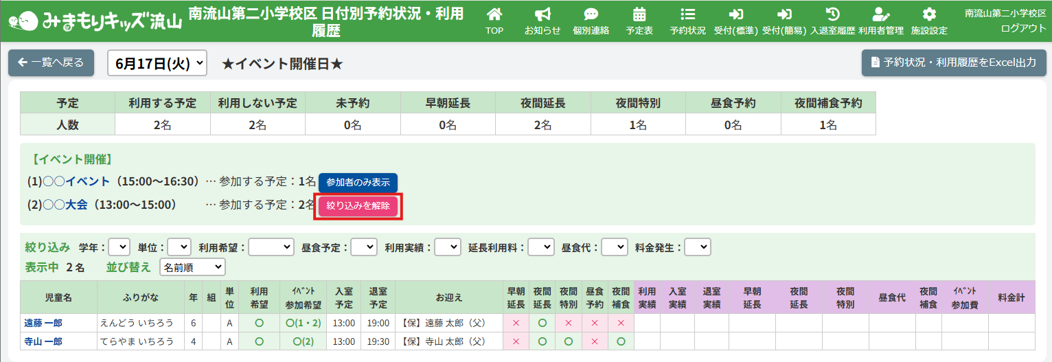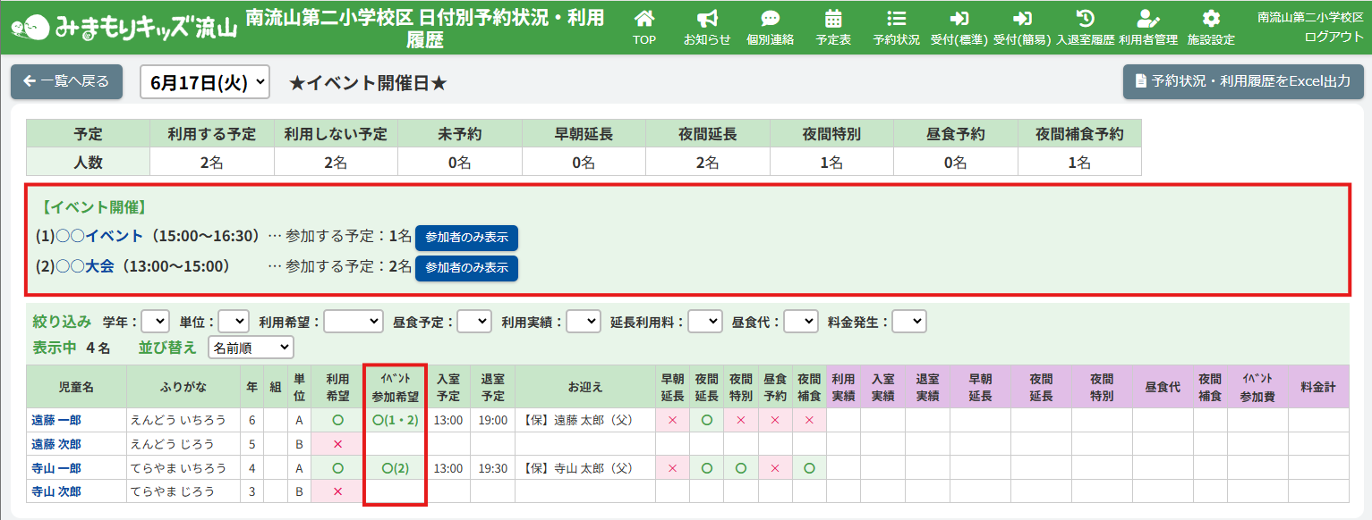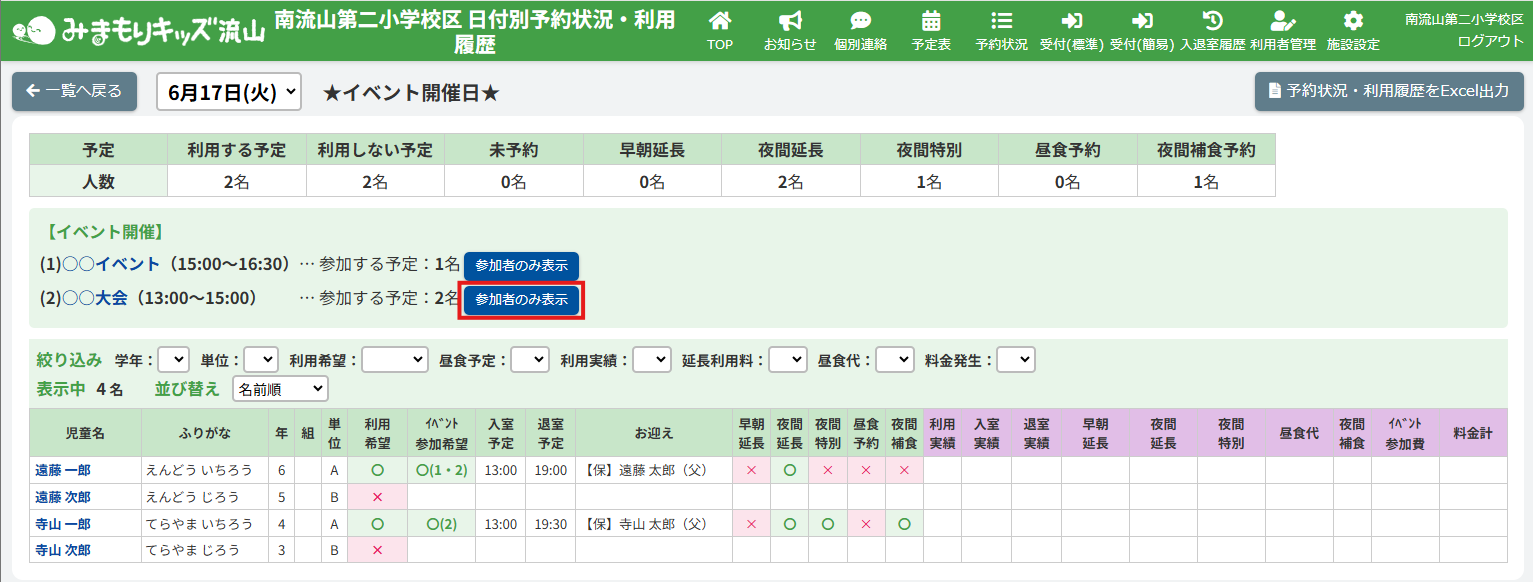 【参加者のみ表示】ボタンをクリックすると、イベントに参加する児童のみを表示することができます。
