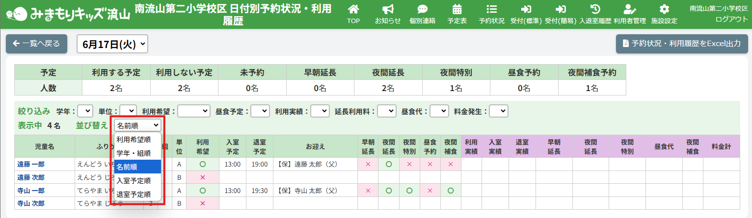 利用希望順 利用希望の有(〇)・無(×)で児童を並び替えて表示します。