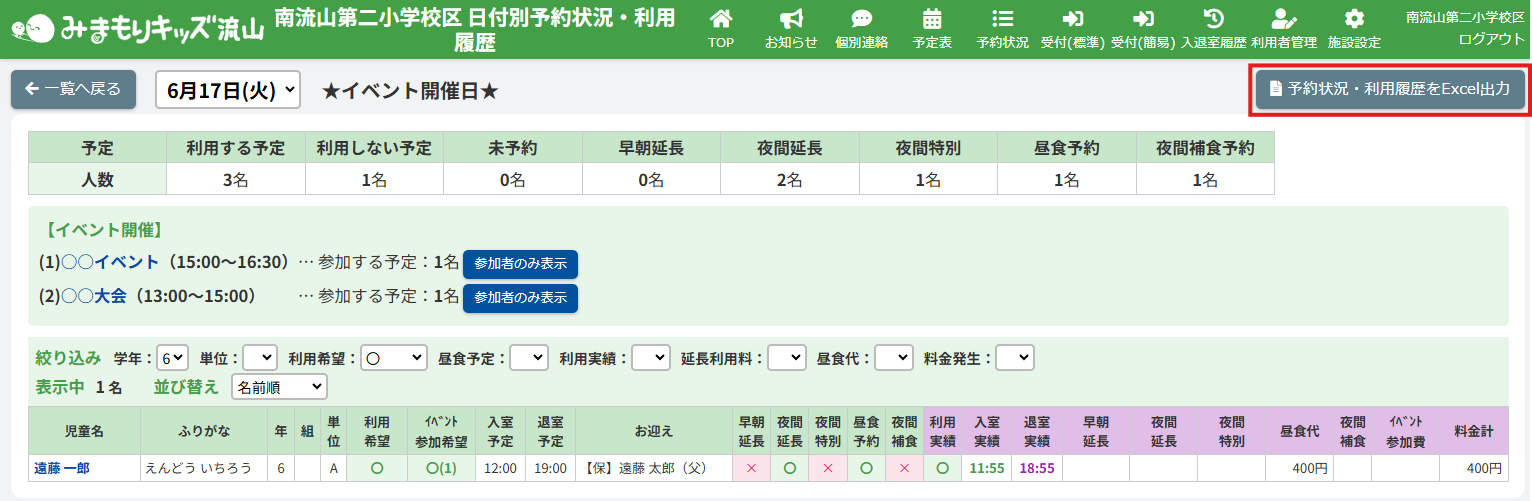 HOME > 入退室履歴 > 日付別予約状況・利用履歴を出力する 日付別予約状況・利用履歴を出力する ここでは、日付別の詳細な利用履歴一覧をExcel形式で出力する機能の確認ができます。 1.履歴を出力する月を選択する 左上の【XX年XX月】のプルダウンより、利用履歴を出力したい月を選択してください。 2.日付別利用履歴ページを開く 利用履歴を出力したい日付をクリックしてください。 3.出力を実行する 画面右上の【予約状況・利用履歴をExcel出力】ボタンをクリックしてください。 4.出力されたExcelデータを開く 出力されたデータが自動でダウンロードされます。ダウンロードファイルをクリックしてExcelデータを開いてください。 予約状況と利用履歴がまとまった表になり出力されます。データの管理や印刷の際にお使いください。 1か月分の利用履歴・利用料を出力する ≫