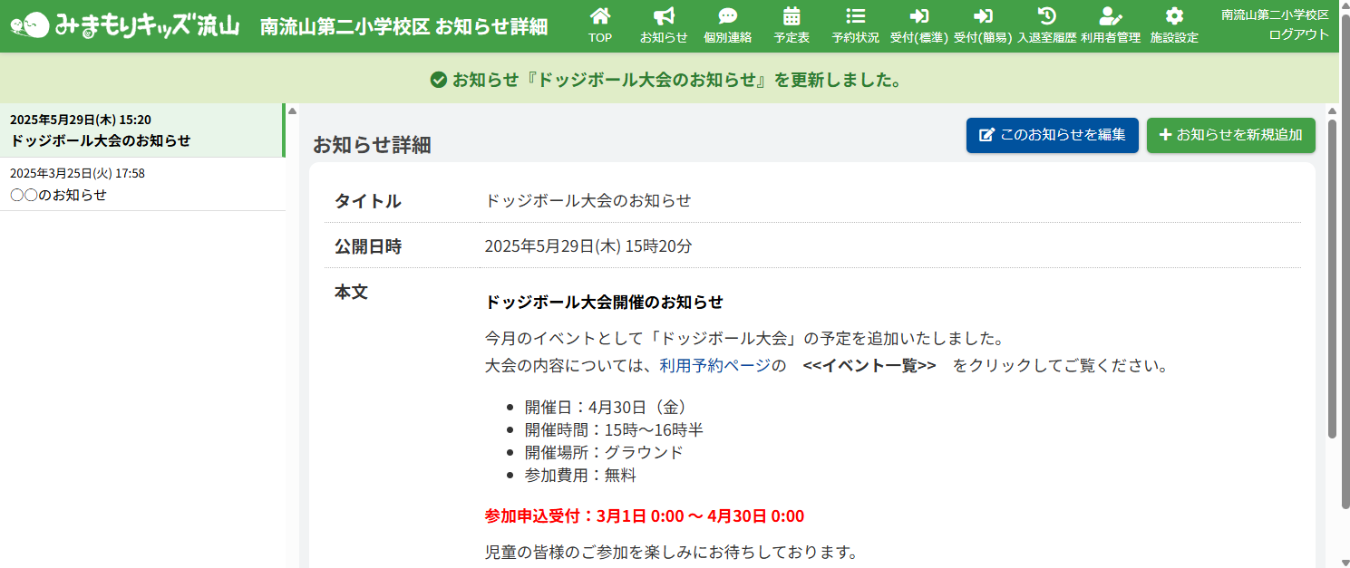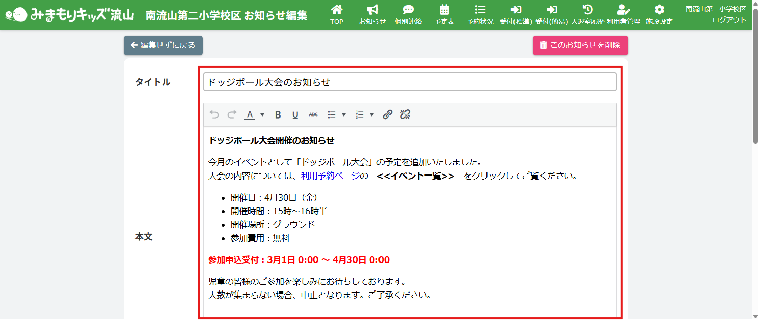 HOME > お知らせ > お知らせを編集する お知らせを編集する 「お知らせを編集する」では、既に保護者へ公開しているお知らせを編集する機能の確認ができます。 1.編集したいお知らせの詳細を開く 施設トップ画面の「保護者へのお知らせ」欄からお知らせをクリックすると、選択したお知らせの詳細が開きます。 また、画面上部の【お知らせ】をクリックすると、最新のお知らせの詳細が開きます。 2.お知らせの編集を開始する お知らせ詳細画面右上の【このお知らせを編集】ボタンをクリックしてください。 3.変更したい項目を編集する 変更したい箇所を項目に沿って編集してください。 4.お知らせの編集を完了する 編集が完了したら、画面下部の【上記内容でお知らせを更新】ボタンをクリックしてください。 5.お知らせの更新を確認する 画面上部のアナウンスと、お知らせの更新内容を確認してください。 お知らせを削除する ≫