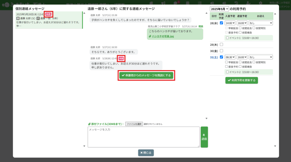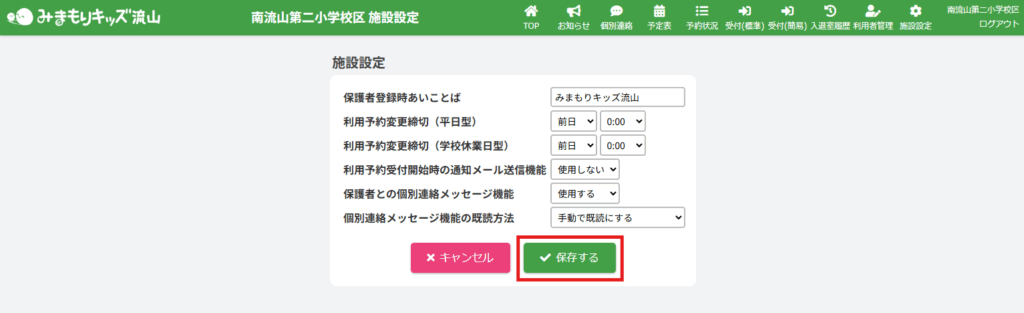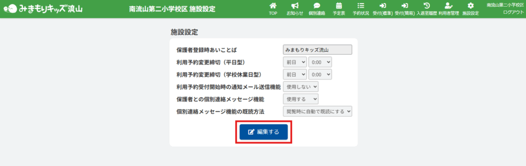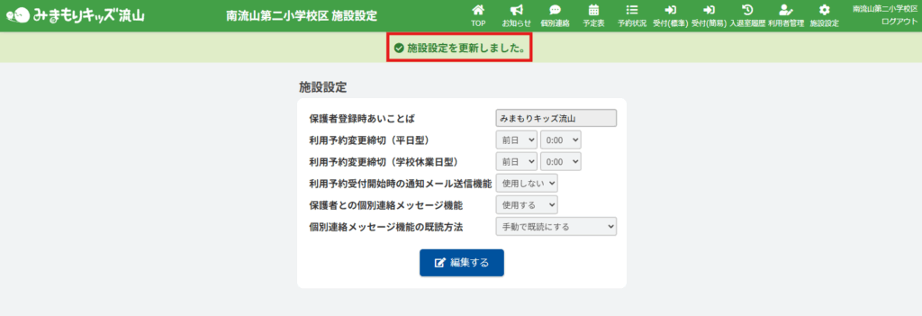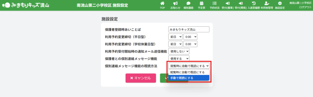 HOME > 個別連絡メッセージ > メッセージの既読方法を設定する メッセージの既読方法を設定する 施設設定画面で個別連絡メッセージ機能の既読方法を設定できます。 「閲覧時に自動で既読にする」とは… 保護者からのメッセージを表示した際に、自動的に既読状態になります。 「手動で既読にする」とは… 保護者からのメッセージを表示した際に、【保護者からのメッセージを既読にする】ボタンが表示されます。 このボタンをクリックする、またはメッセージを送信すると既読状態になります。 「手動で既読にする」に設定時の表示 1.施設設定を表示 【施設設定】ボタンをクリックして設定画面を表示してください。 2.施設設定を編集 【編集する】ボタンをクリックすると設定を編集することができます。 3.個別連絡メッセージ機能の既読方法を変更 「個別連絡メッセージ機能の既読方法」の右側を【手動で既読にする】に設定してください。 初期は【閲覧時に自動で既読にする】に設定されています。 4.変更を保存 設定が完了したら、【保存する】ボタンをクリックしてください。 更新が完了すると、以下のように表示されます。