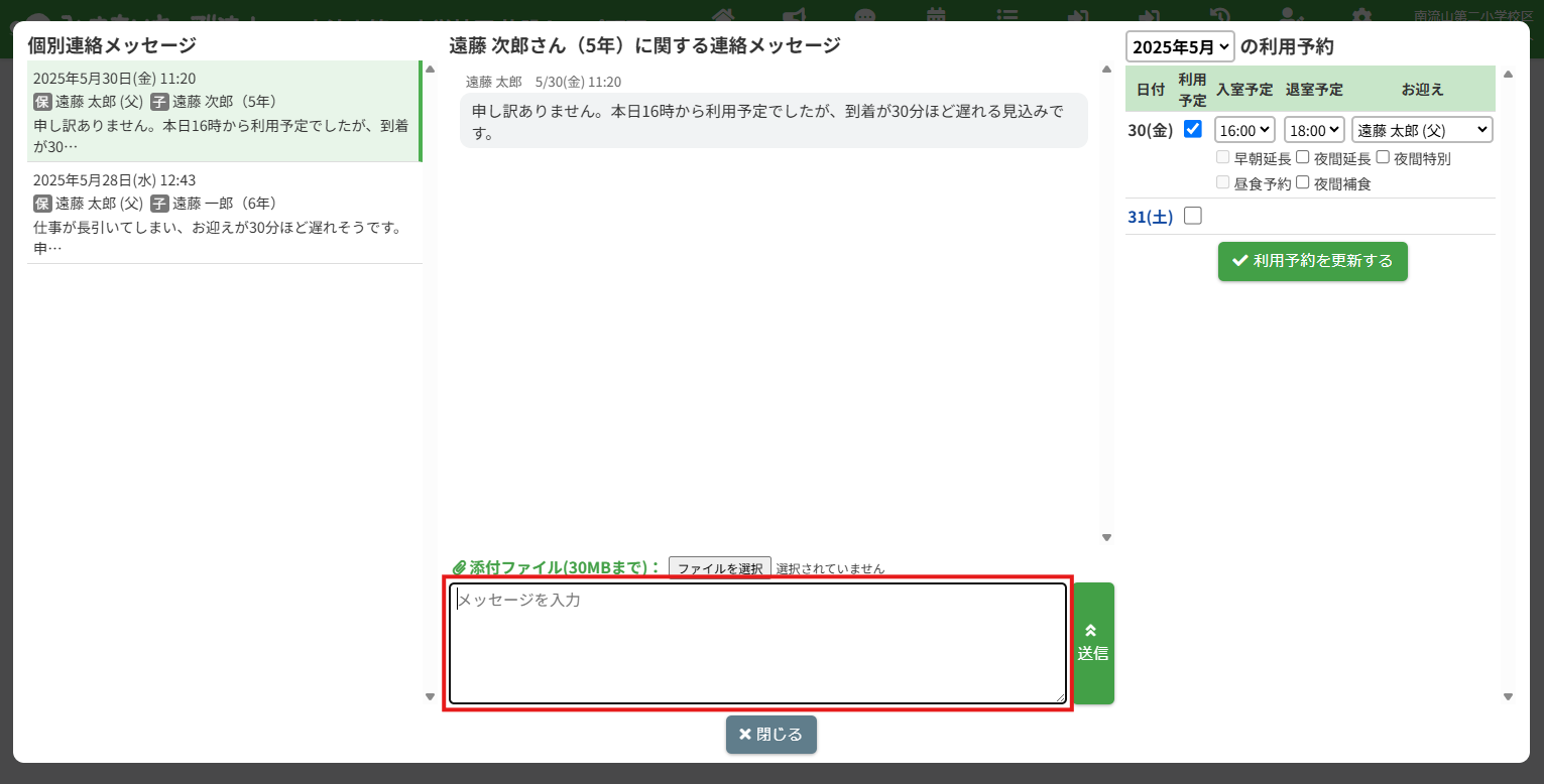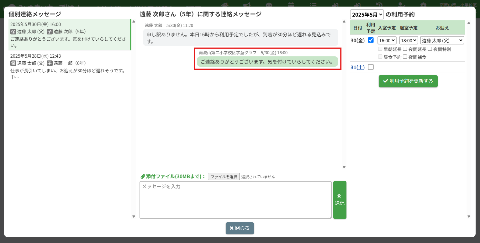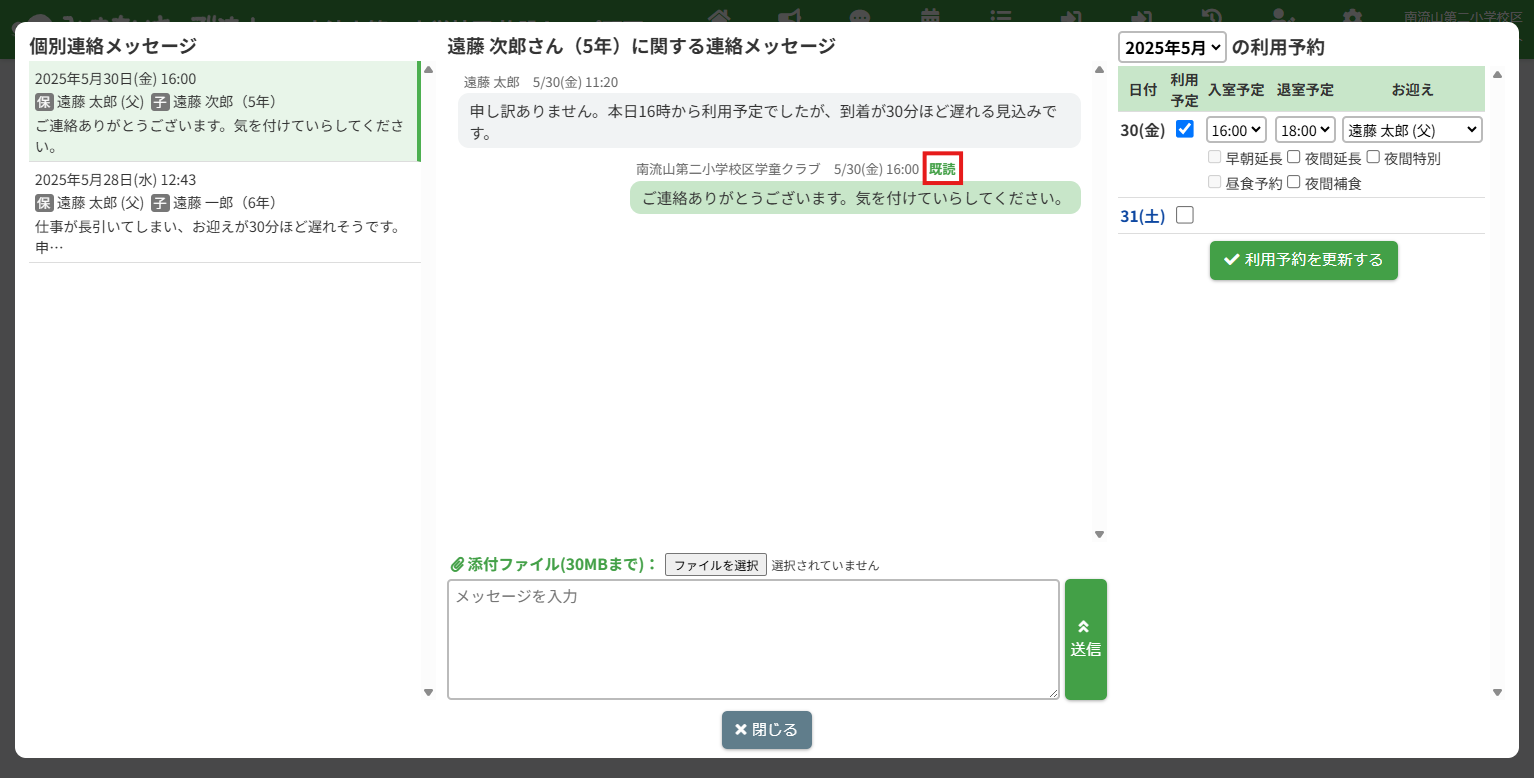 HOME > 個別連絡メッセージ > メッセージの返信 メッセージの返信 「メッセージの返信」では、個別連絡メッセージの返信機能について確認ができます。 また、既読表示の機能についても確認できます。 1.個別連絡メッセージを表示する 個別連絡メッセージを表示します。画面上部の【個別連絡】をクリックしてください。 2.返信したいメッセージスレッドを表示する 個別連絡メッセージのポップアップが表示されます。 画面左側のスレッド一覧から、確認したい児童のメッセージスレッドをクリックしてください。 3.メッセージを入力する 送信したいメッセージの内容を【メッセージを入力】欄へ入力してください。 4.メッセージを送信する 入力が完了したら、【送信】ボタンをクリックしてください。 メッセージが送信されます。その際、保護者宛てにプッシュ通知・メール通知も送信されます。 5.送信したメッセージの確認 送信したメッセージは緑色の枠付きで表示されます。 6.メッセージの既読表示機能 送信したメッセージを保護者が確認すると、各メッセージに【既読】マークが表示されます。 施設側からメッセージを新たに送信する ≫