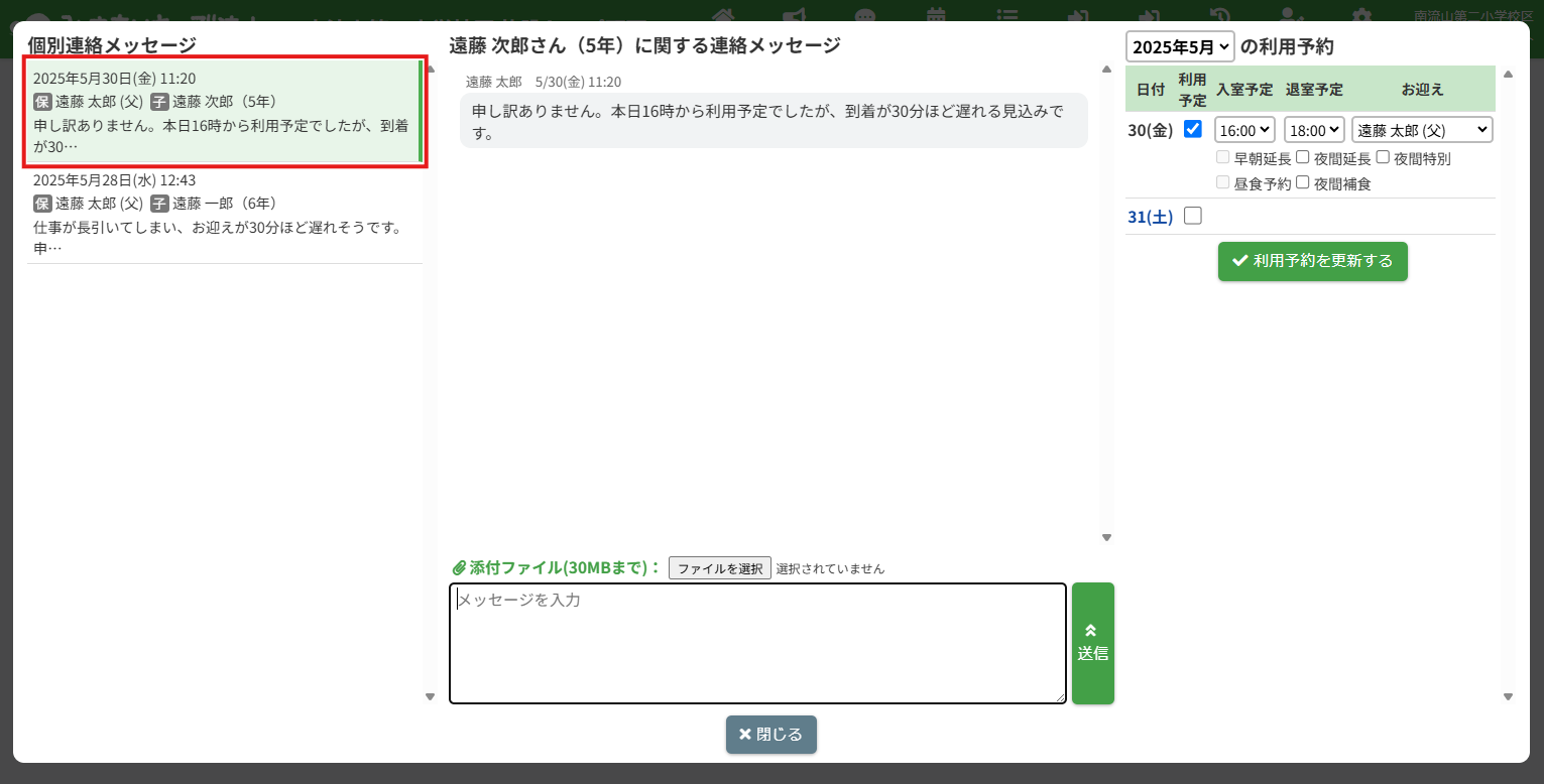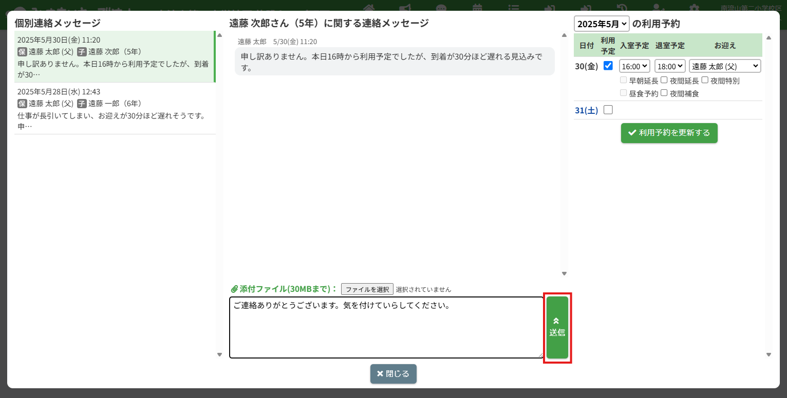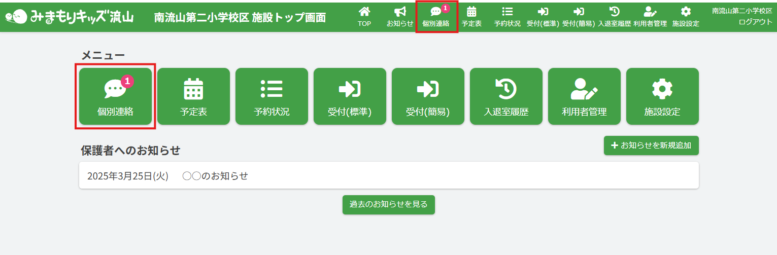 HOME > 個別連絡メッセージ > メッセージの返信 メッセージの返信 「メッセージの返信」では、個別連絡メッセージの返信機能について確認ができます。 また、既読表示の機能についても確認できます。 1.個別連絡メッセージを表示する 個別連絡メッセージを表示します。画面上部の【個別連絡】をクリックしてください。 2.返信したいメッセージスレッドを表示する 個別連絡メッセージのポップアップが表示されます。 画面左側のスレッド一覧から、確認したい児童のメッセージスレッドをクリックしてください。 3.メッセージを入力する 送信したいメッセージの内容を【メッセージを入力】欄へ入力してください。 4.メッセージを送信する 入力が完了したら、【送信】ボタンをクリックしてください。 メッセージが送信されます。その際、保護者宛てにプッシュ通知・メール通知も送信されます。 5.送信したメッセージの確認 送信したメッセージは緑色の枠付きで表示されます。 6.メッセージの既読表示機能 送信したメッセージを保護者が確認すると、各メッセージに【既読】マークが表示されます。 施設側からメッセージを新たに送信する ≫
