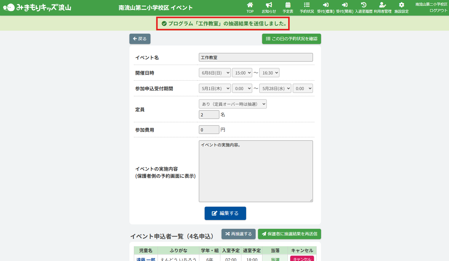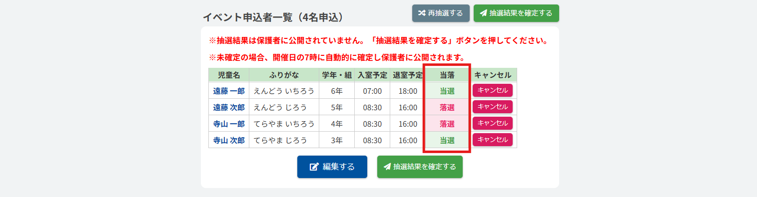 以下のように表示され、保護者に抽選結果が送信されます。