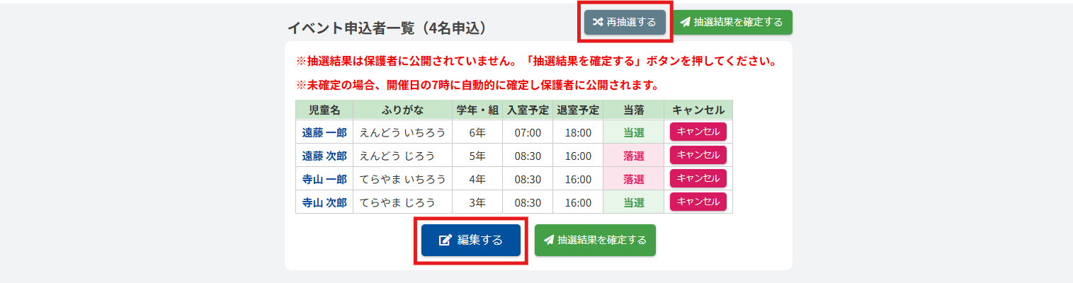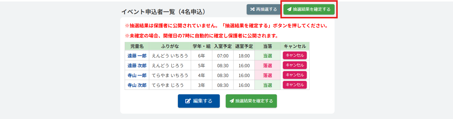 抽選結果に問題がなければ【抽選結果を確定する】ボタンをクリックしてください。