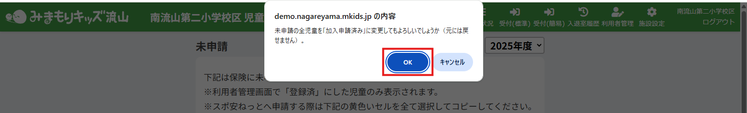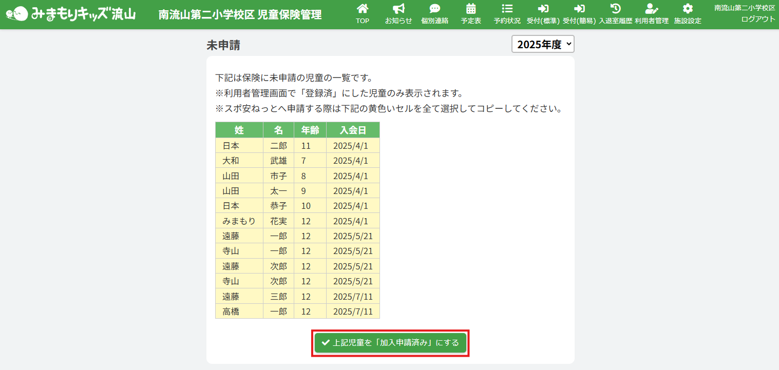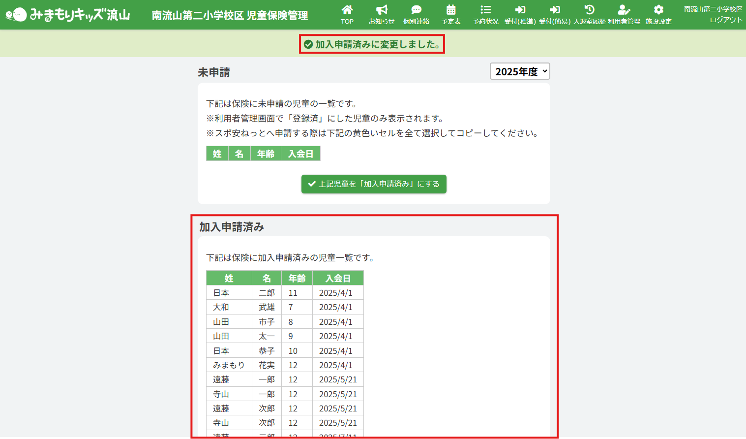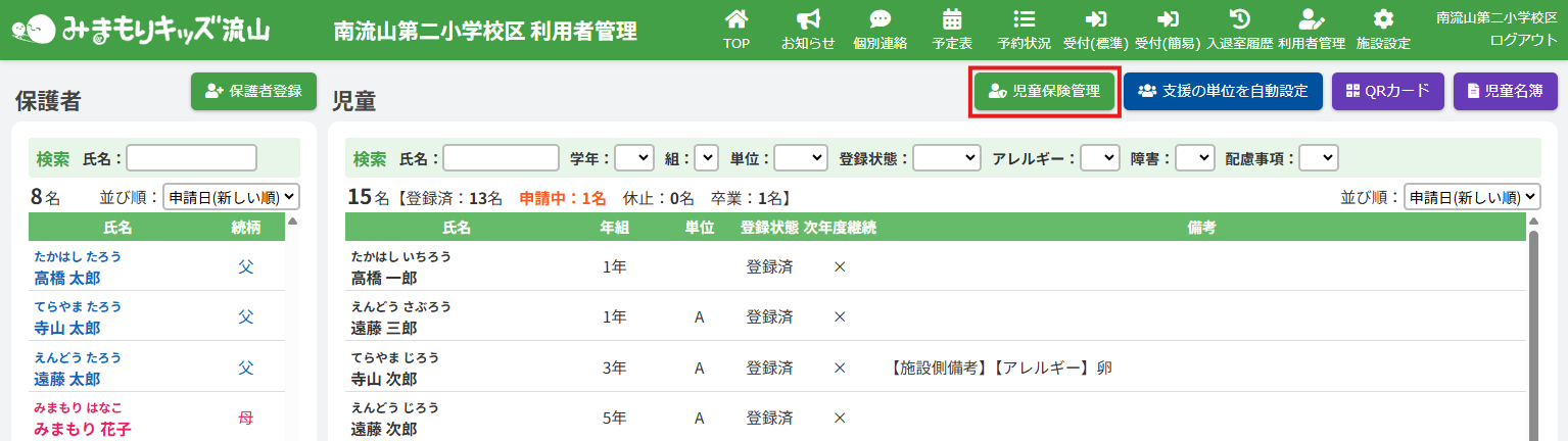 HOME > 利用者管理 > 児童保険管理を行う 児童保険管理を行う ここでは、児童の保険加入申請の状況が一覧で表示され、主に未申請児童の管理をする補助機能の確認ができます。 ※この機能で児童保険の申請ができるわけではありません。 1.児童保険管理画面を開く 利用者管理の画面上部にある【児童保険管理】ボタンをクリックしてください。 2.未申請の児童を「加入申請済み」にする 児童保険の申請を行ってから下記手順を行ってください。 「未申請」の児童一覧を確認し、【上記児童を「加入申請済み」にする】ボタンをクリックしてください。 ※一度「加入申請済み」にした児童を「未申請」に戻すことはできませんので、ご注意ください。 下記のアラートが表示されます。 問題なければ【OK】ボタンをクリックして下さい。 3.「加入申請済み」になったことを確認する 加入申請済みの変更が完了します。 「未申請」の児童一覧にあった児童の氏名が「加入申請済み」に移動したことを確認してください。 QRカードを出力する ≫