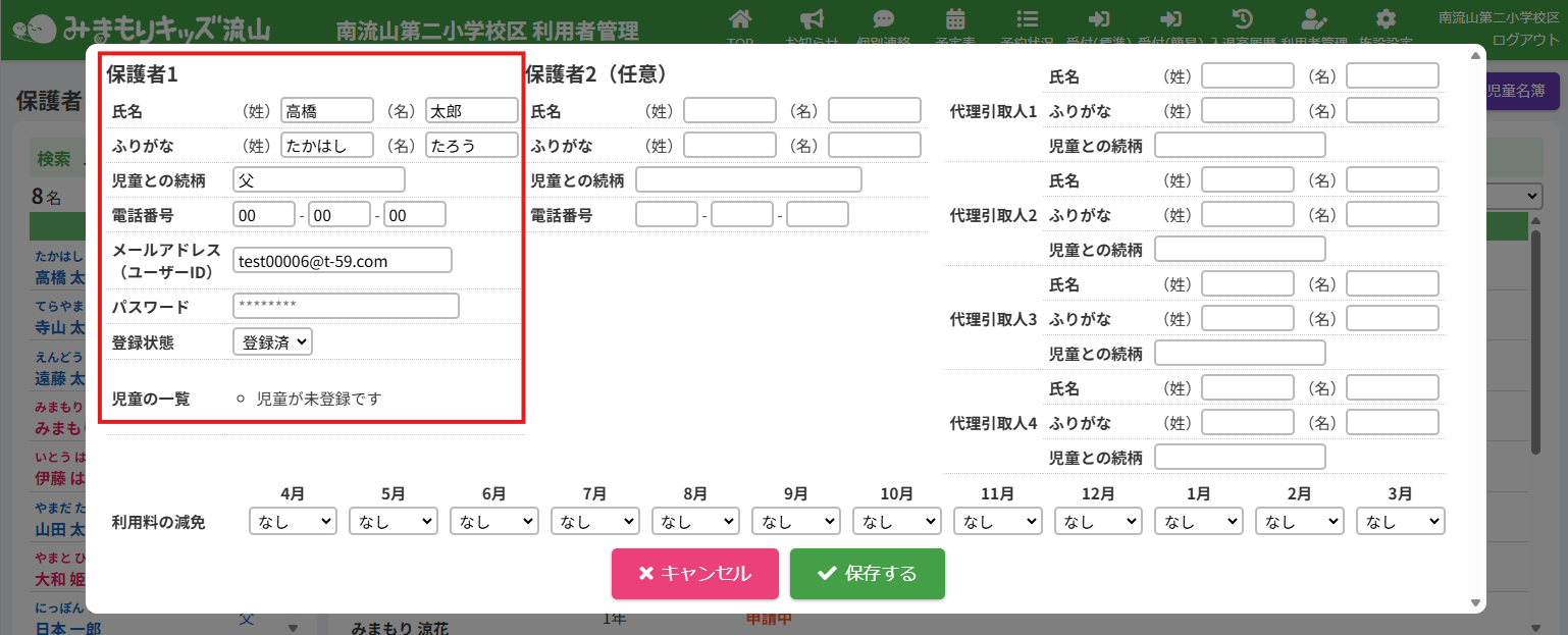 HOME > 利用者管理 > 保護者の登録内容を変更する 保護者の登録内容を変更する ここでは、登録中の保護者情報を編集する機能の確認ができます。 1.保護者編集フォームを開く 登録内容を変更したい保護者の氏名をクリックしてください。 2.保護者の登録内容の編集を実行する ウィンドウ下部の【編集する】ボタンをクリックしてください。 3.登録内容を変更する 各項目に沿って変更したい内容を入力、選択してください。 4.登録内容の編集を保存する 入力が完了したら、ウィンドウ下部の【保存する】ボタンをクリックして下さい。 5.保護者の編集を完了する 保護者の登録内容の変更が完了します。【閉じる】ボタンをクリックするとウィンドウが閉じられます。 保護者のユーザーIDやパスワードの変更、代理引取人の登録、利用料の減免等を設定できます。 詳しくは下記のリンクをクリックしてご確認ください。 児童を登録する ≫ 保護者のユーザーIDやパスワードを変更する ≫ 代理引取人を登録・変更する ≫ 利用料の減免を設定する ≫ 保護者の利用を休止する ≫ 保護者の登録を抹消する ≫ 保護者のユーザーIDやパスワードを変更する ≫