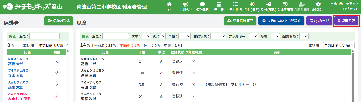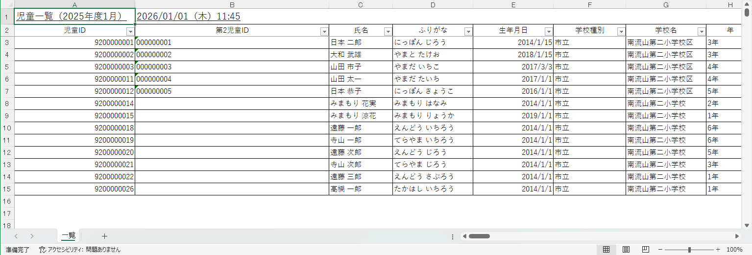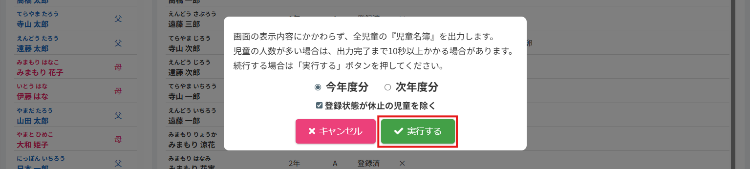 HOME > 利用者管理 > 児童名簿を出力する 児童名簿を出力する ここでは、登録されている全児童の名簿をExcel形式で出力する機能の確認ができます。 ※児童の検索・絞り込み機能の利用に関わらず施設に登録されている全児童の名簿を出力します。 1.児童名簿出力フォームを開く 利用者管理画面の上部にある【児童名簿】ボタンをクリックしてください。 2.児童名簿出力を実行する 児童名簿出力フォームが表示されます。 各選択項目を確認して【実行する】ボタンをクリックしてください。 ※1月~3月の場合、今年度と次年度の選択欄が表示されます。 ※【登録状態が休止の児童を除く】にチェックすると、現在休止している児童を除いた児童名簿が出力されます。 3.出力されたExcelデータを開く Excelデータのダウンロードが開始されます。 出力されたダウンロードファイルをクリックしてExcelデータを開いてください。 全児童を一覧表示したシートが表示されますので、ご確認ください。