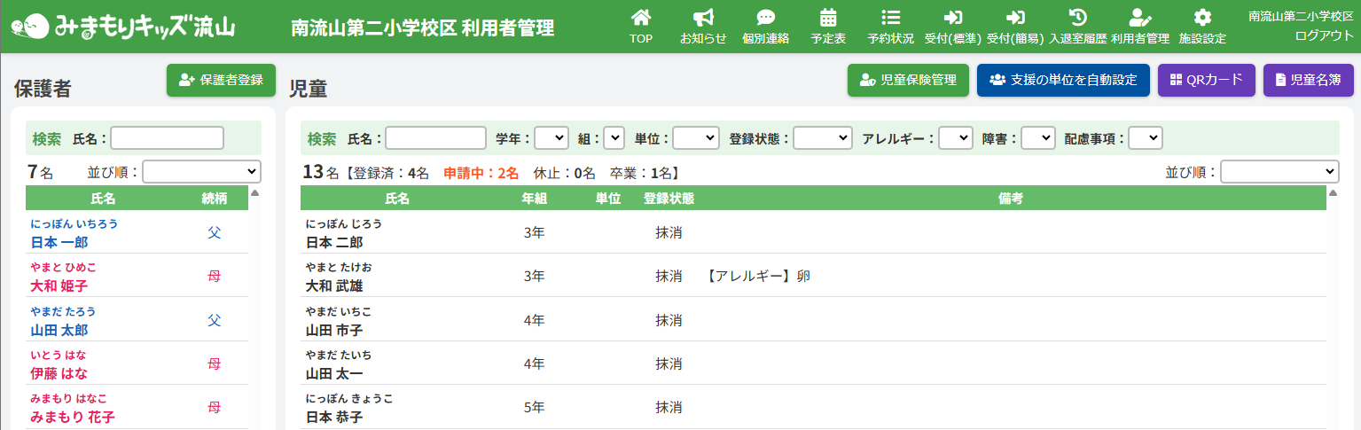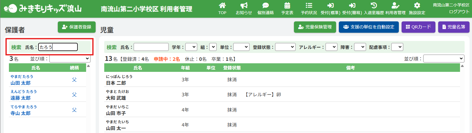 ここでは、一覧の中から特定の保護者・児童を表示させる機能の確認ができます。