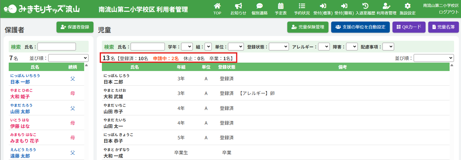児童の合計人数と各登録状態の人数が表示されます。