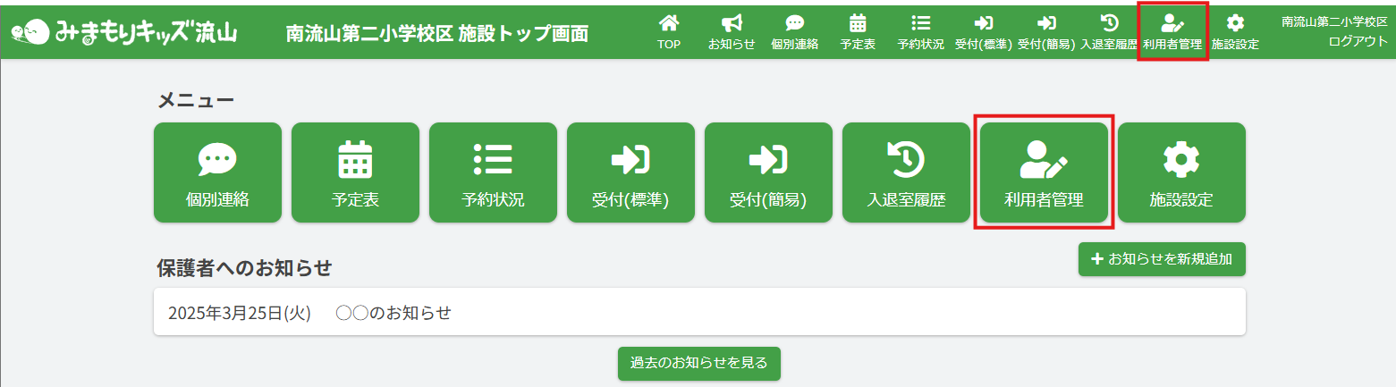 トップ画面または画面右上の、【利用者管理】をクリックしてください。