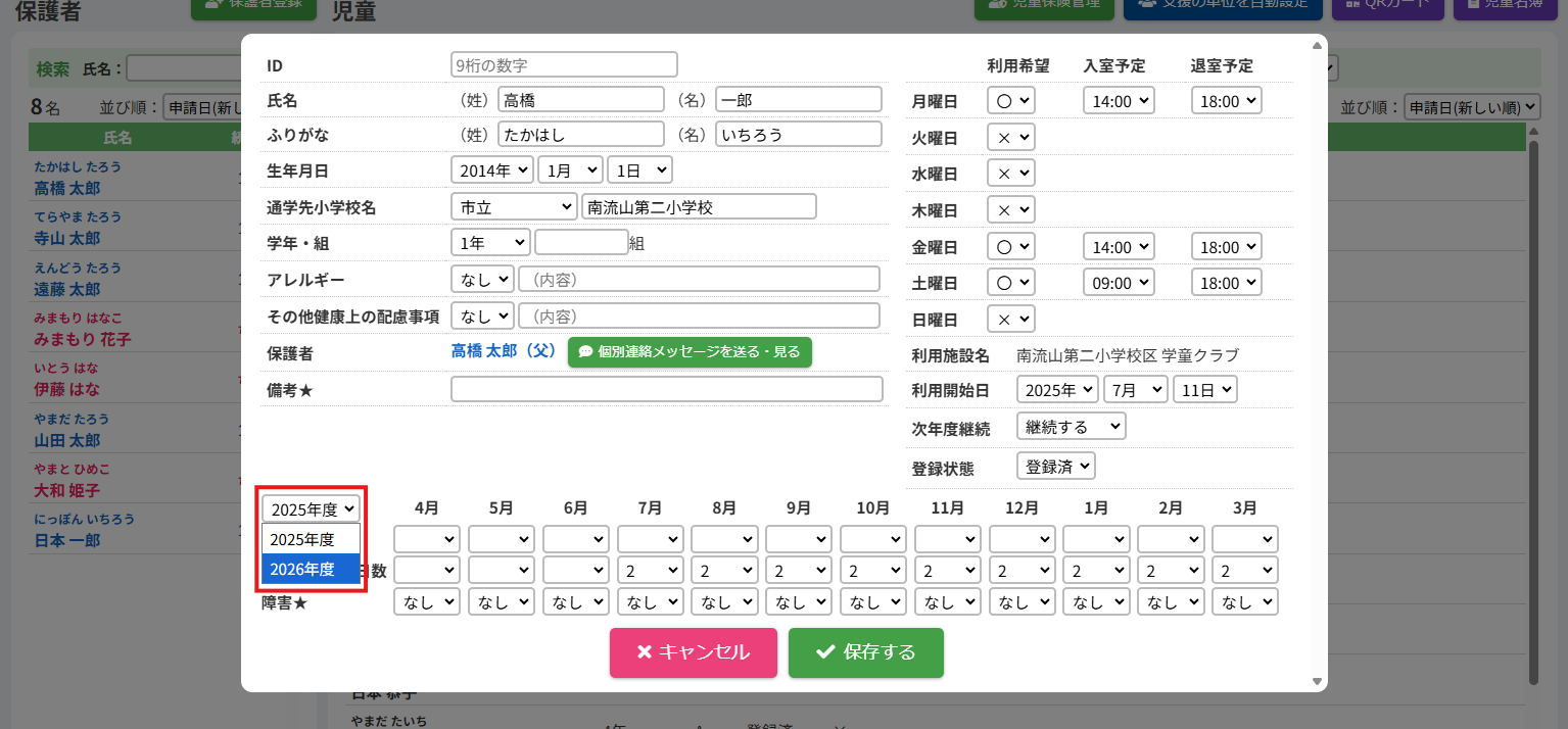 保護者より次年度の利用申込書を受け取り次第、本操作を行います。