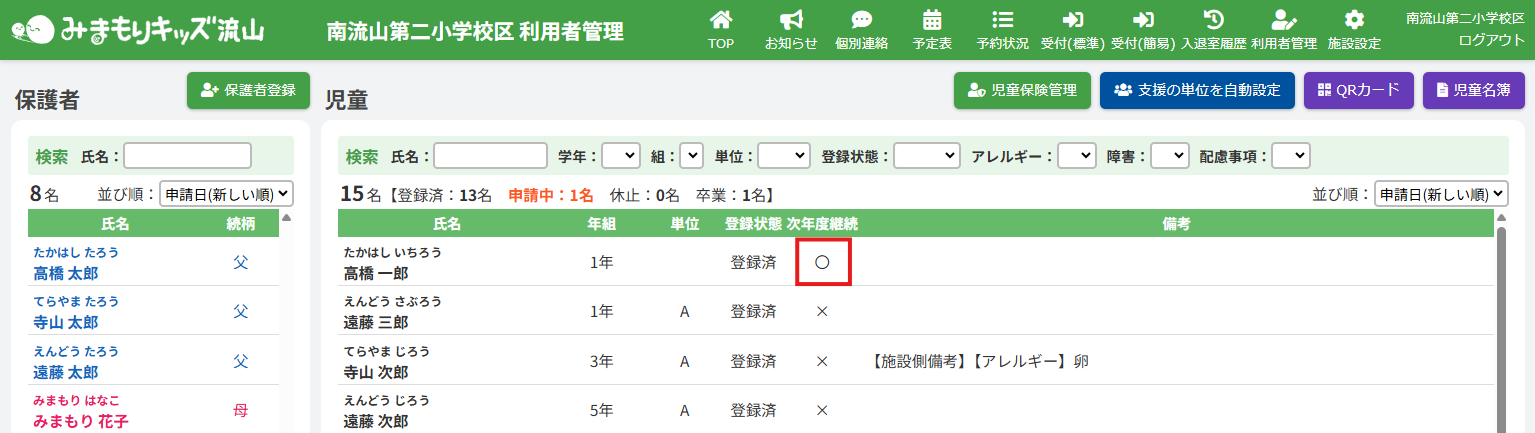 児童の次年度継続の設定が完了します。次年度継続が「継続しない」から「継続する」になったことを確認してください。