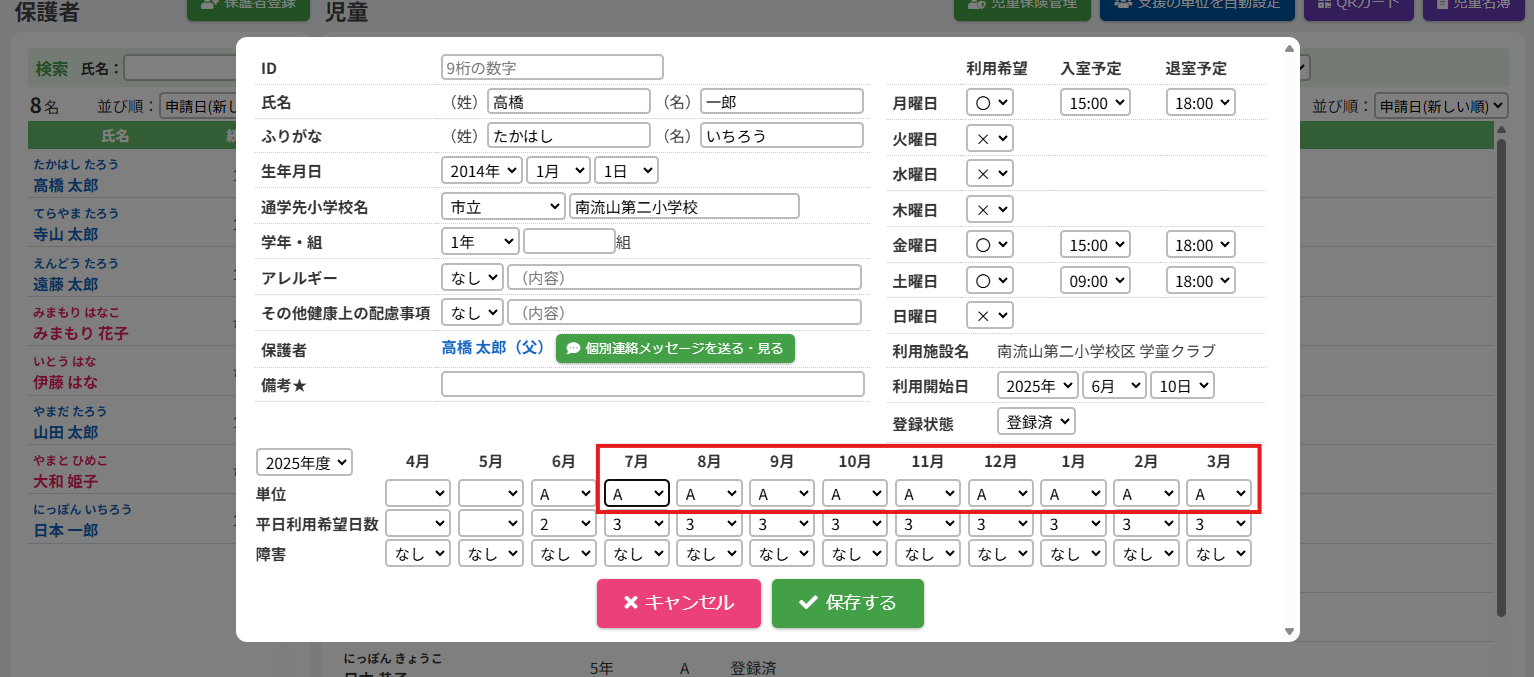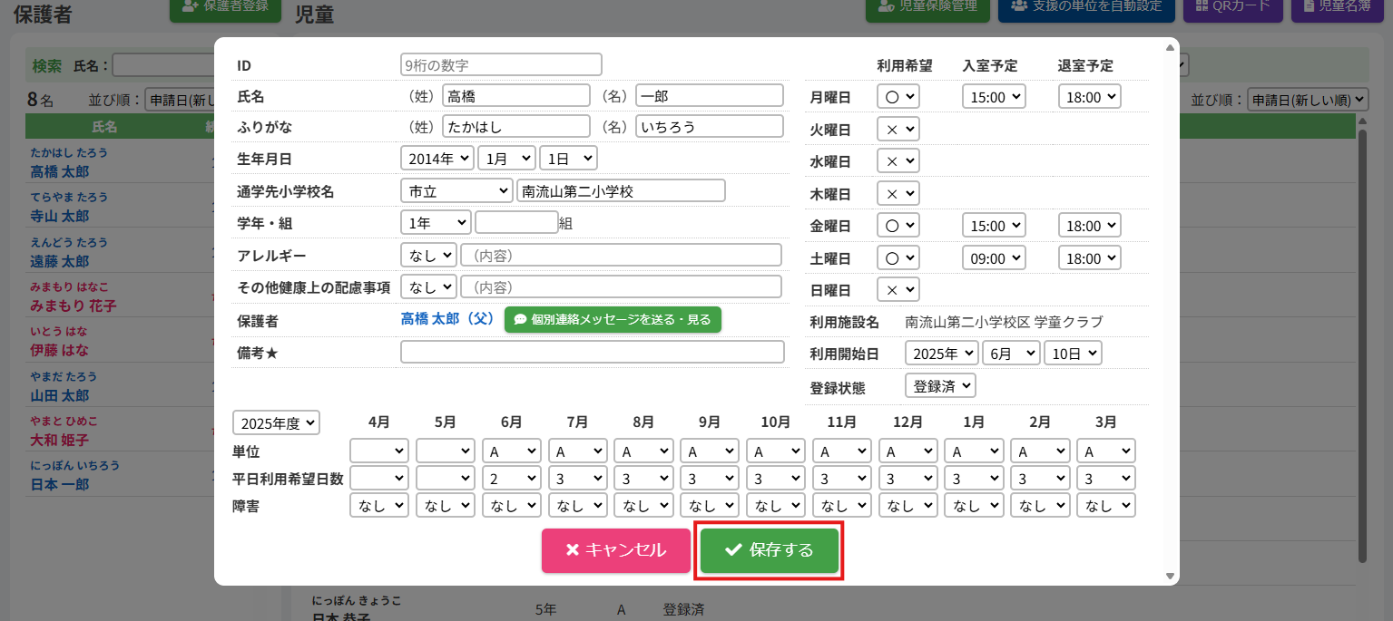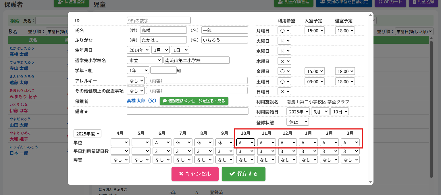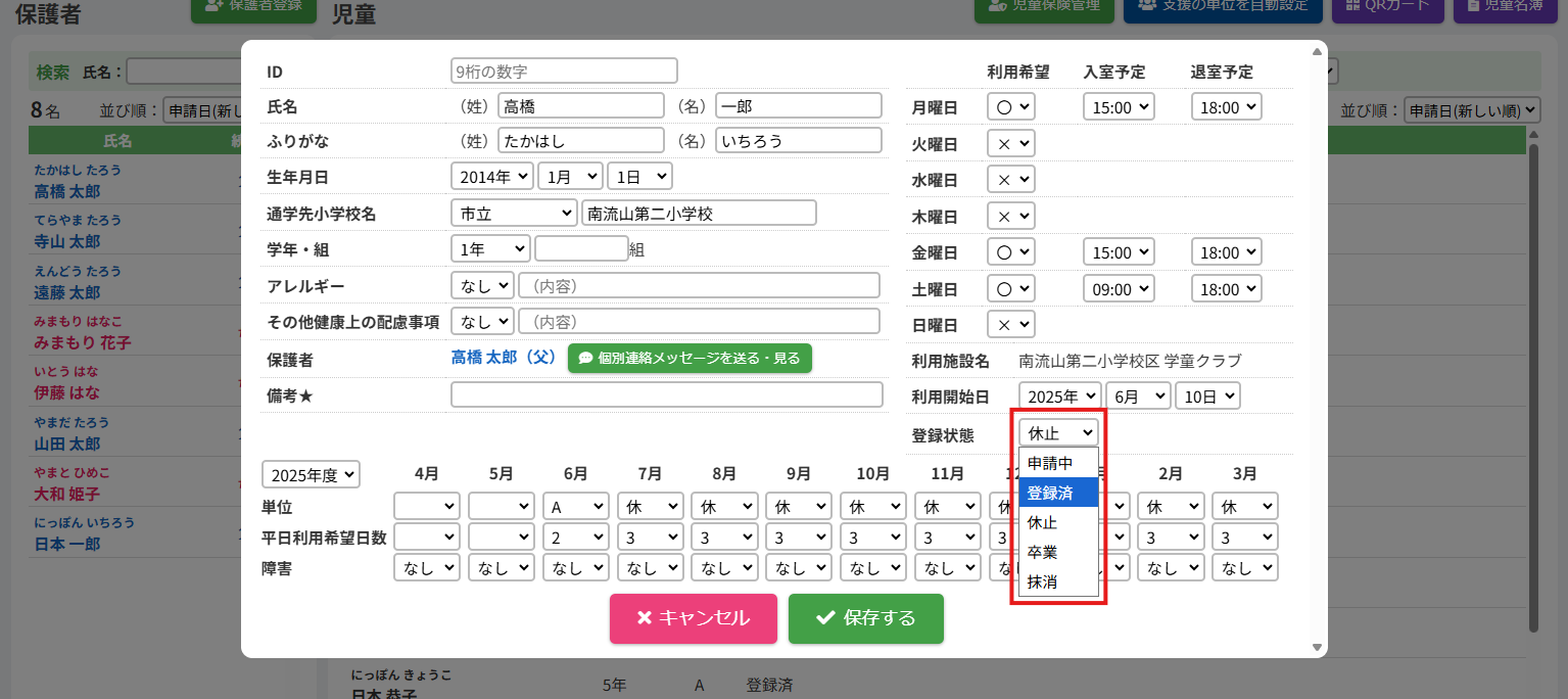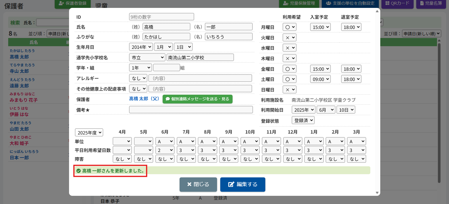 HOME > 利用者管理 > 児童の利用を再開する 児童の利用を再開する 「利用の再開」とは… 休止中の保護者及び児童が利用を再開する場合に設定します。 ここでは、児童の登録状態を月ごとに変更し、登録済に変更する機能の確認ができます。 1.児童編集フォームを開く 利用を再開したい児童の氏名をクリックしてください。 2.児童の登録内容の編集を実行する ウィンドウ下部の【編集する】ボタンをクリックして下さい。 3.児童の利用を再開する <当月から利用再開する場合> 登録状態欄の選択肢から「登録済」を選択してください。 当月の単位に「A~H」を設定してください。選択した月以降に単位が反映されます。 例:7月に単位「A」で再開する場合、単位の7月の選択肢から「A」を選択してください。 7月から翌3月までの単位が「A」に変更されます。 <翌月以降から利用再開する場合> 翌月以降から利用を再開する場合、登録状態は変更せず、再開する月の単位に「A~H」を選択してください。 例:10月から単位「A」で利用を再開する場合、単位の10月の選択肢から「A」を選択してください。 10月から翌3月までの月の単位が「A」に変更されます。 4.登録状態の変更を保存する 入力が完了したら、ウィンドウ下部の【保存する】ボタンをクリックして下さい。 5.利用再開の完了 児童の利用の再開が完了します。 当月から利用を再開する場合、登録状態が「休止」から「登録済」に、単位が選択したものになったことを確認してください。 翌月以降から利用を再開する場合、再開する月になったら登録状態が「登録済」に変更されます。 【閉じる】ボタンをクリックするとウィンドウが閉じられます。 児童の登録を抹消する ≫